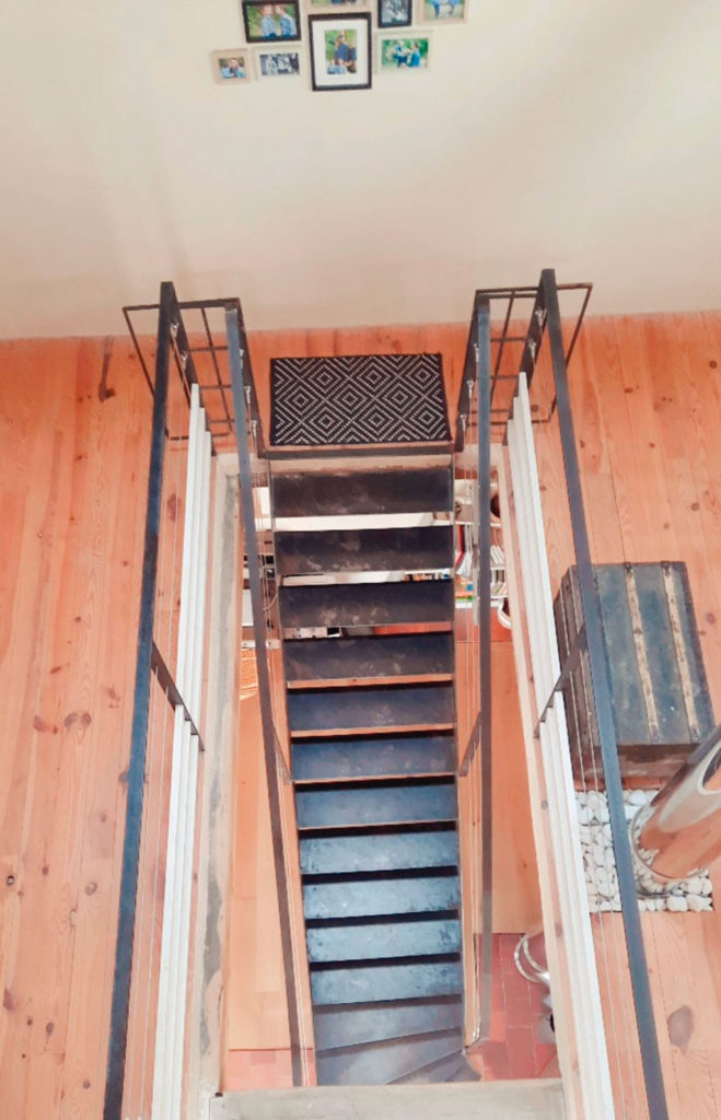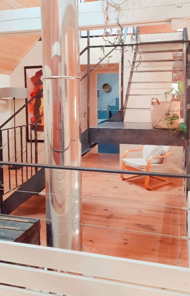 Au centre de cette pièce de vie, un magnifique escalier en métal noir qui donne une touche moderne à ce bien atypique. Mais aussi une pièce maîtresse de leur grange… un poêle de masse ! Économique et écologique, il permet de chauffer toute la maison grâce au bois de résine. De quoi donner une ambiance chaleureuse à la maison tout en respectant l’environnement.