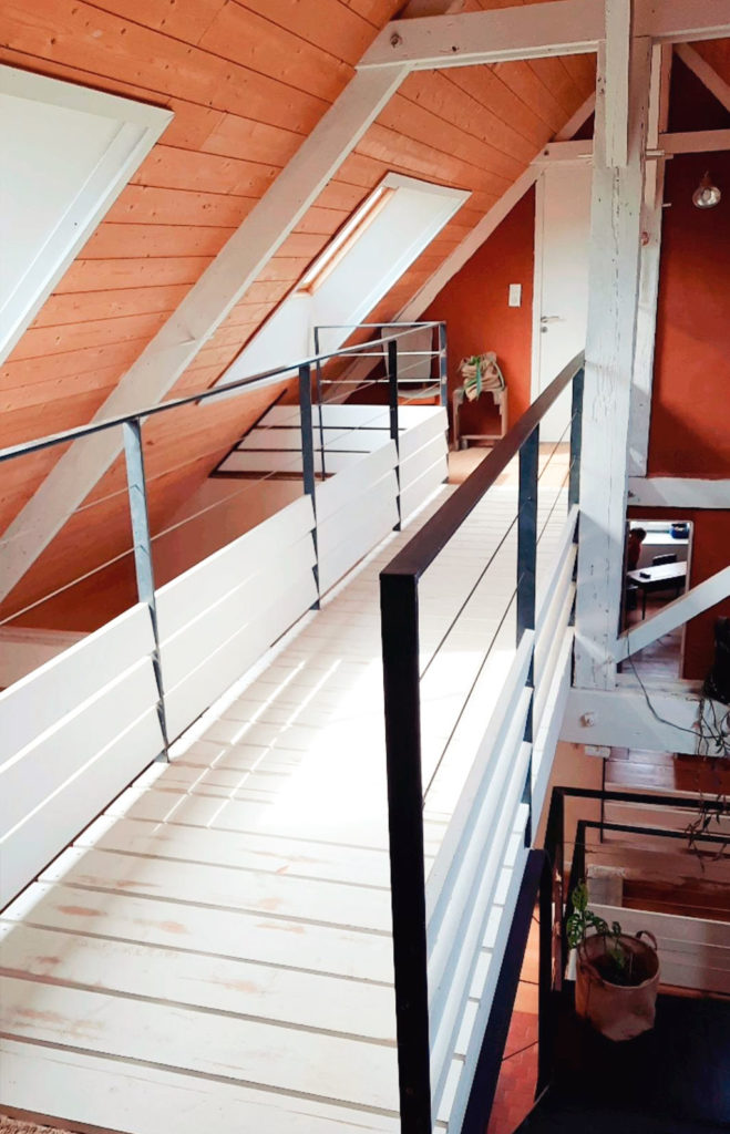 Au fil de l’escalier, celui-ci nous conduit au second palier servant de coin bureau sous les toits. Une grande passerelle dessert deux petites chambres de chaque coté, celle du dernier fils et une chambre d’amis.
